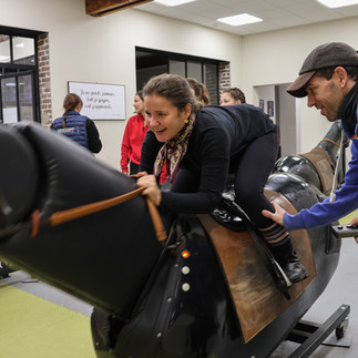 Maîtrise du cheval mécanique : les participants apprennent les bases, comme faire un pont, ajuster leurs étriers et trouver leur équilibre en position de course,